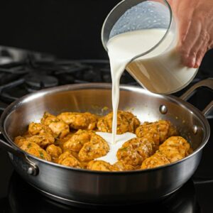 Lower the heat and add fresh cream to the chicken, mixing thoroughly. Let it simmer for 5-10 minutes until the chicken is tender and the flavors are well combined.
